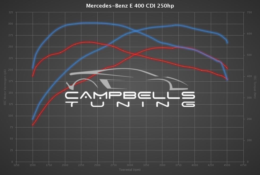 Campbells tuning F.Z.E is leading in the development of Mercedes-Benz E 400 CDI 260hp tuning files. The development of each Mercedes-Benz E 400 CDI 260hp tuning file is the result of perfection and dedication by Campbells tuning F.Z.E programmers. The organization only uses the latest technologies and has many years experience in ECU remapping software. Many (chiptuning) organizations around the globe download their tuning files for Mercedes-Benz E 400 CDI 260hp at Campbells tuning F.Z.E for the best possible result. All Mercedes-Benz E 400 CDI 260hp tuning files deliver the best possible performance and results within the safety margins.